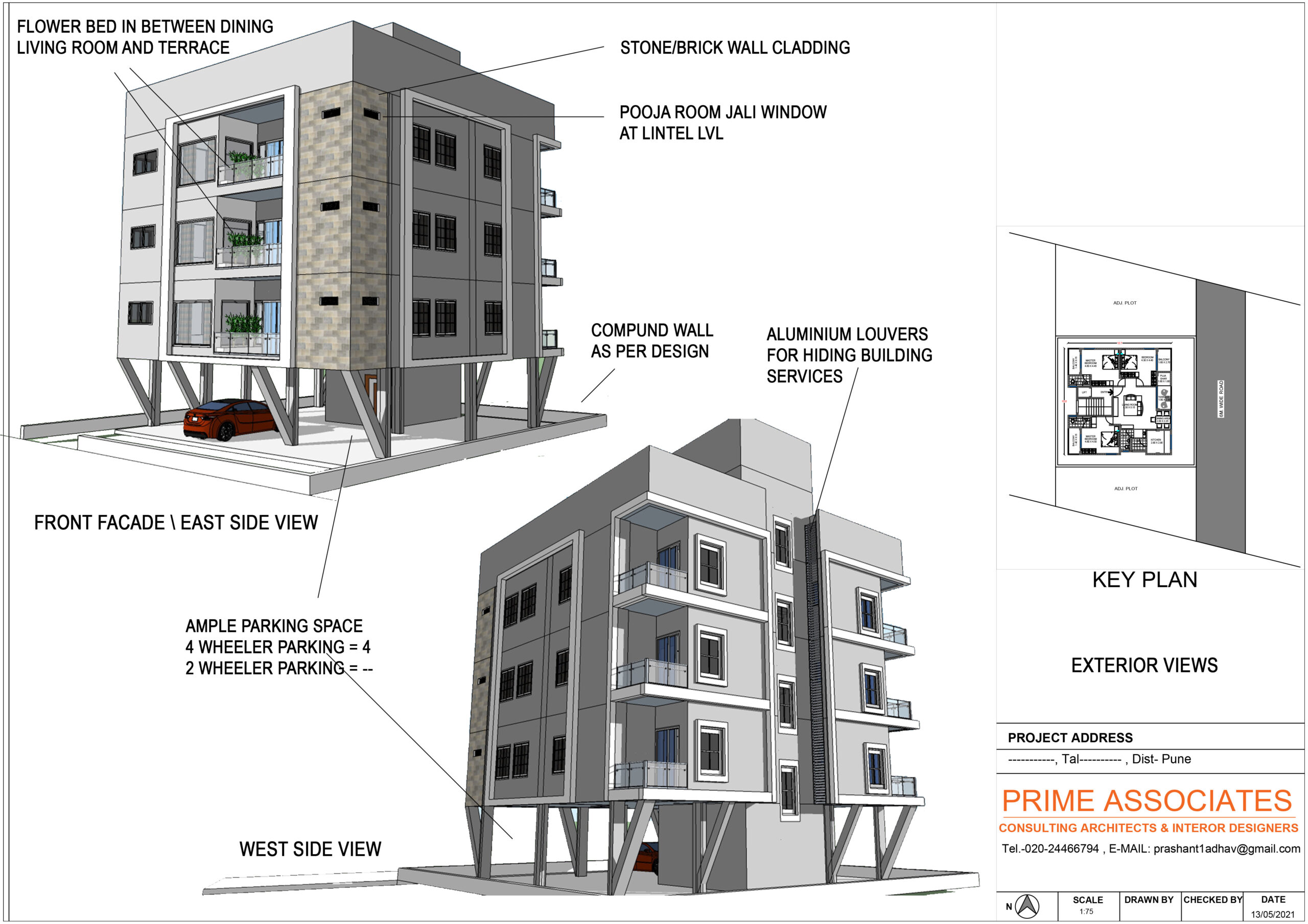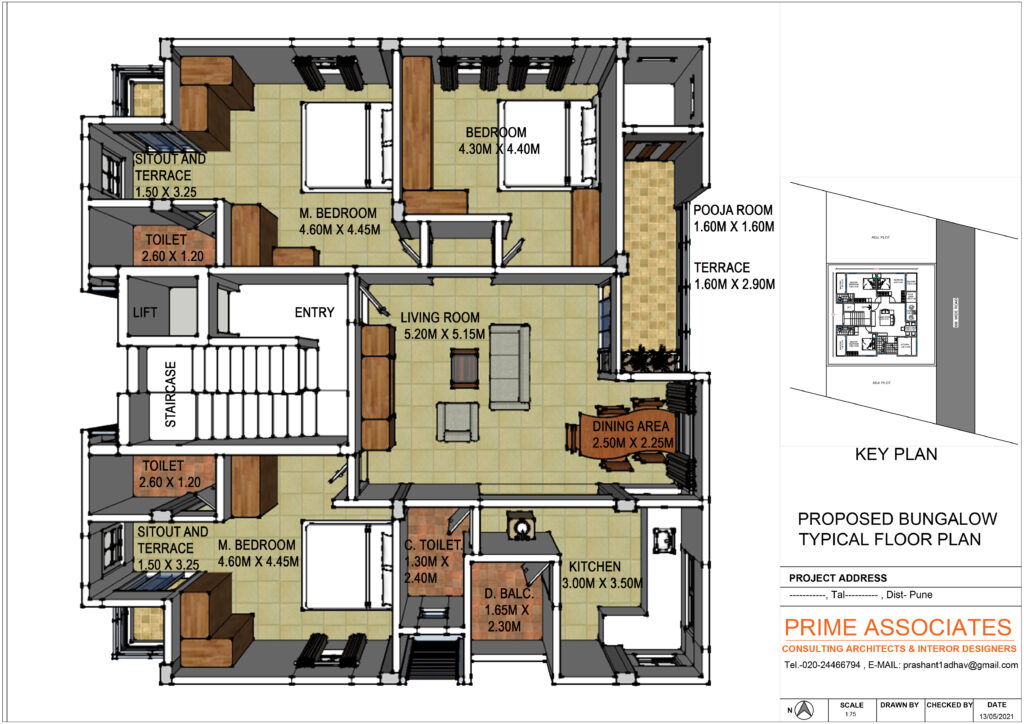 Prime Associates prepared the complete design of a bungalow at Warje based on Vastushastra principles, ensuring harmony, balance, and functionality. The project also included 3D modelling and rendering, providing the client with a clear visualization of the final outcome.
